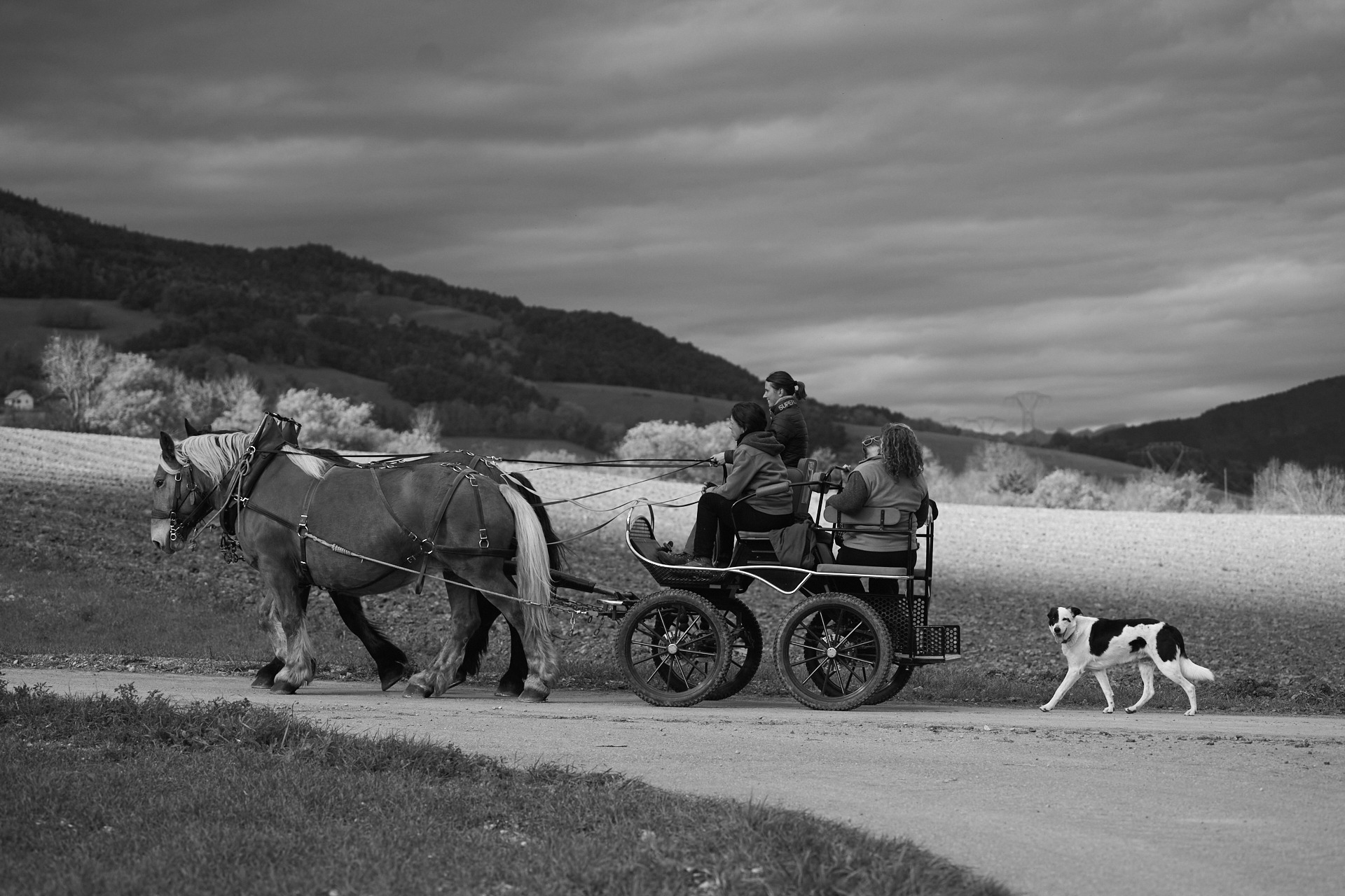 - Une balade en attelage dans notre chariot bâché avec nos chevaux comtois