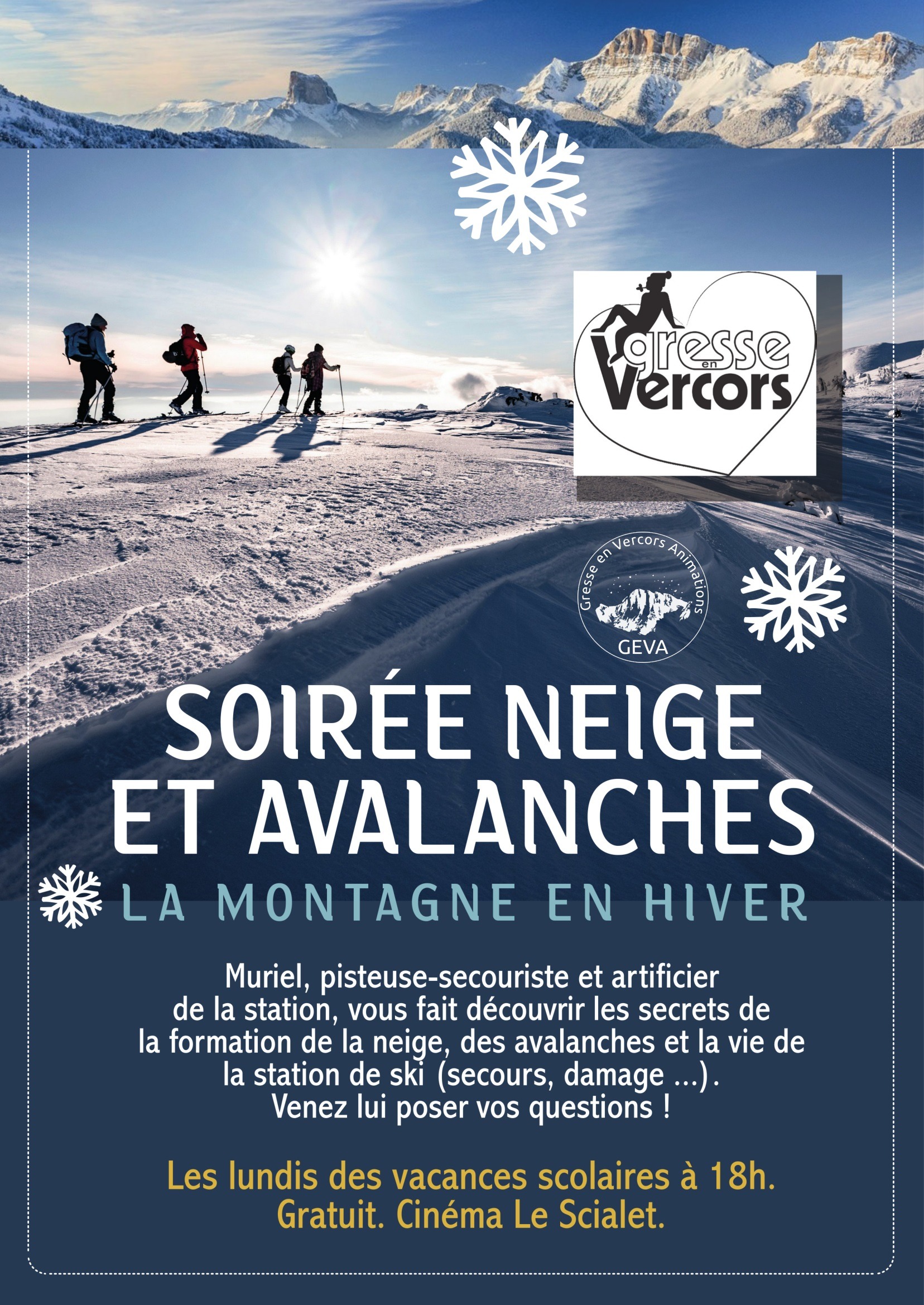 Muriel, pisteuse-secouriste et artificier à la station vous fera découvrir les secrets de la formation de la neige, des avalanches et la vie de la station de ski (secours, damage…) Venez lui poser des questions !