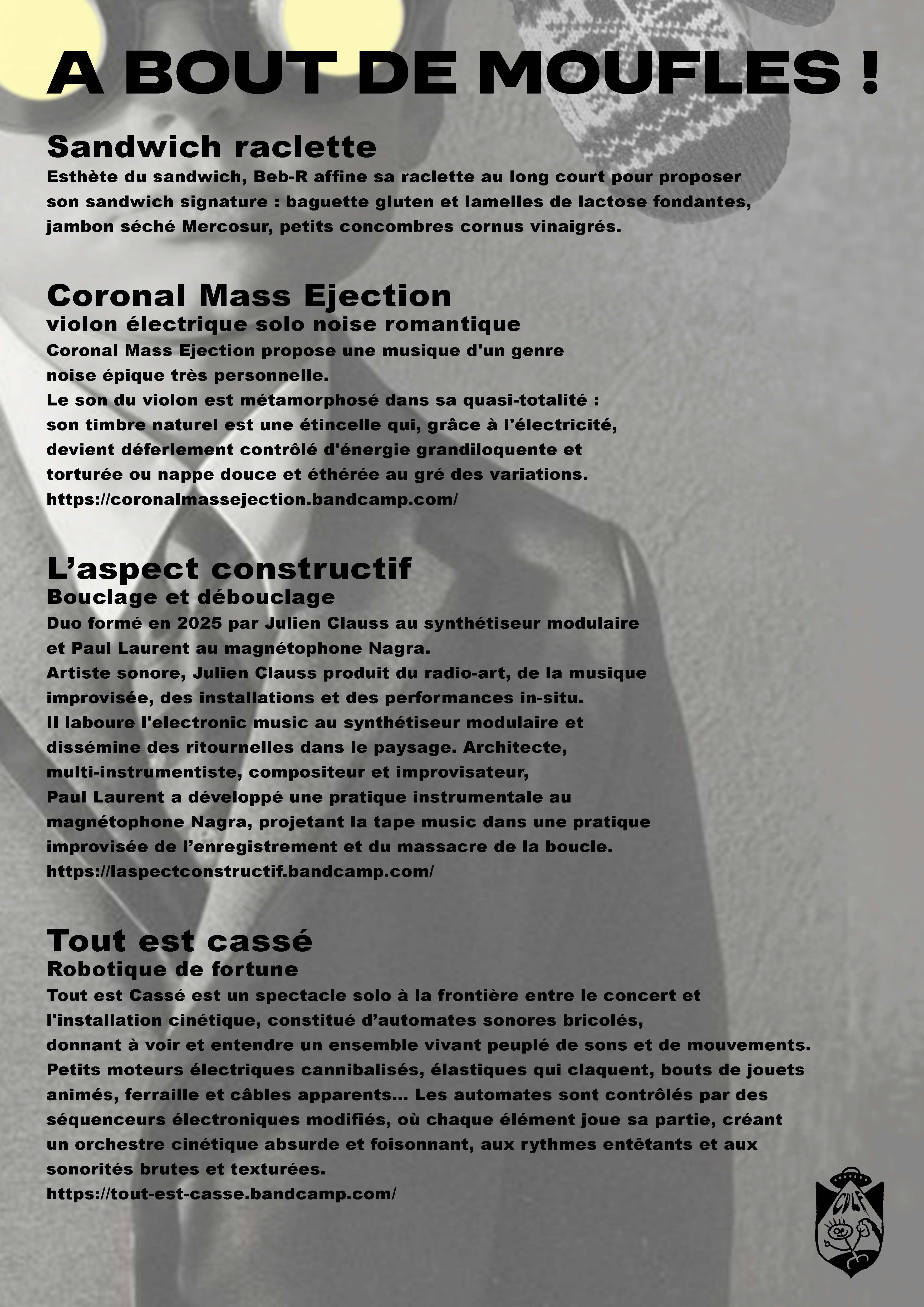 Soirée de 3 concerts de musique expérimentale avec un repas sandwich raclette