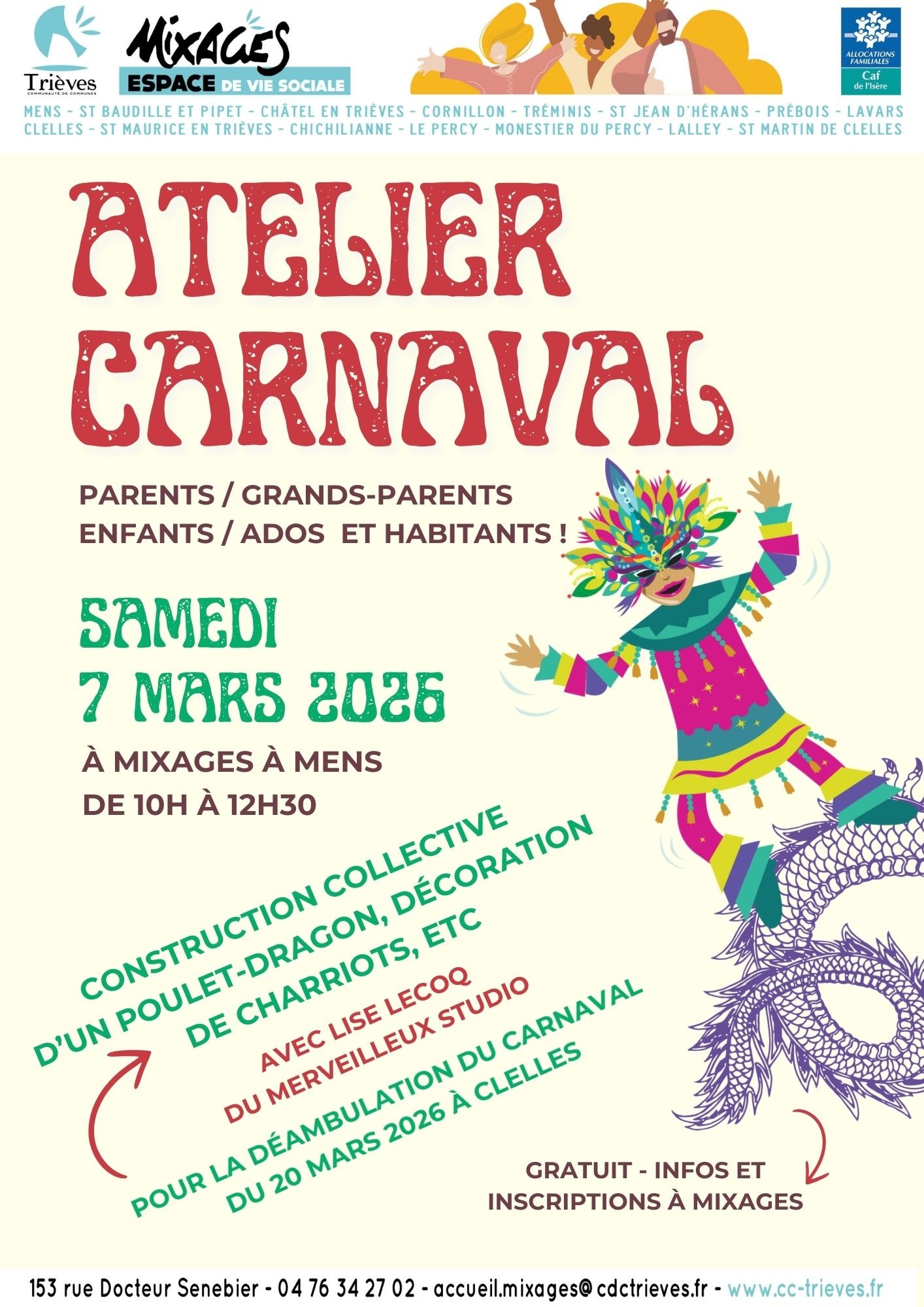 On vous attend nombreux à l'atelier carnaval, enfants, ados, parents, grands parents !!!