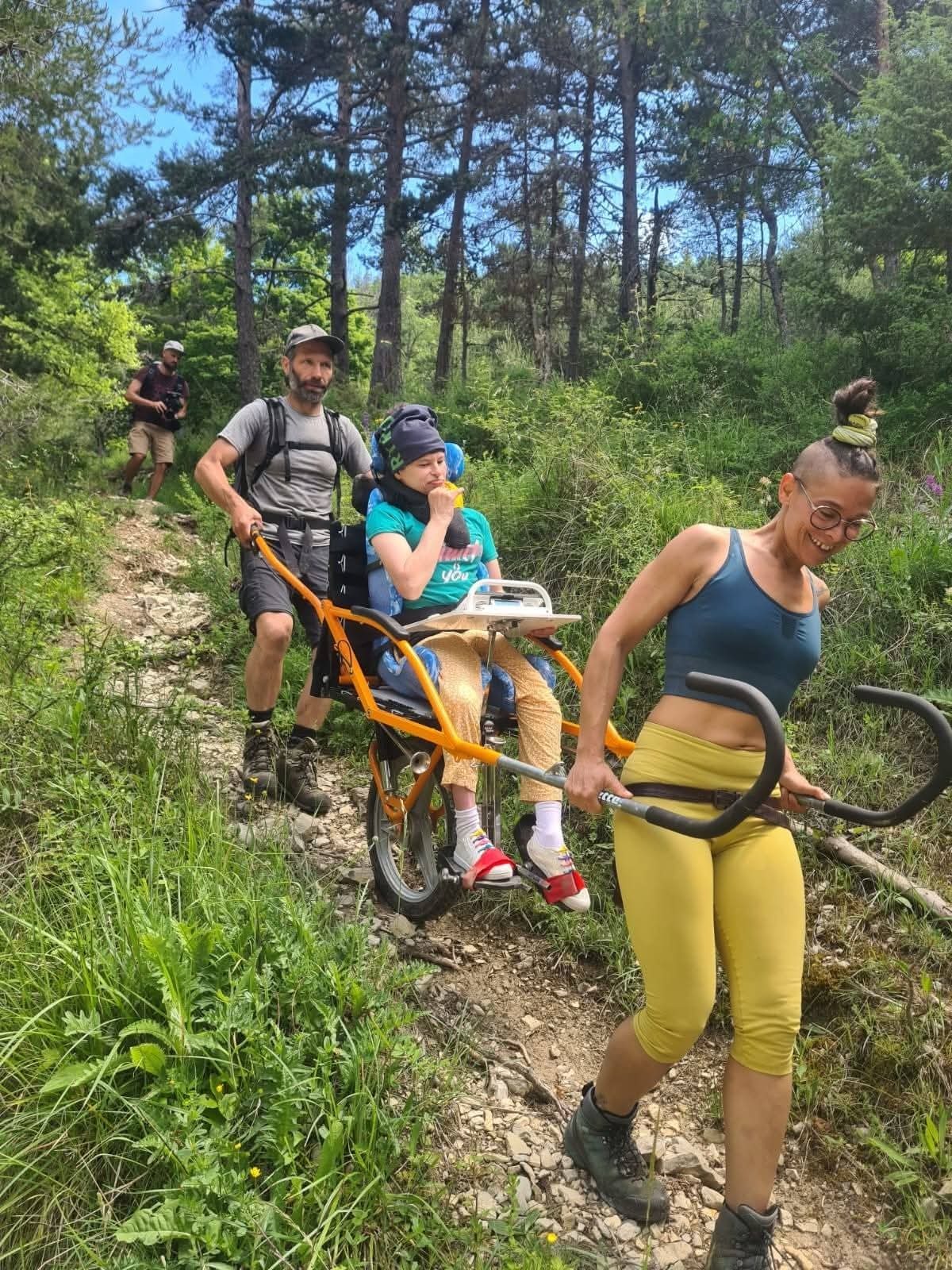 Thanks to adapted equipment (all-terrain wheelchair pulled by my donkeys, joëlette), I can organize mountain outings lasting one or more days, whatever the difficulty or disability: