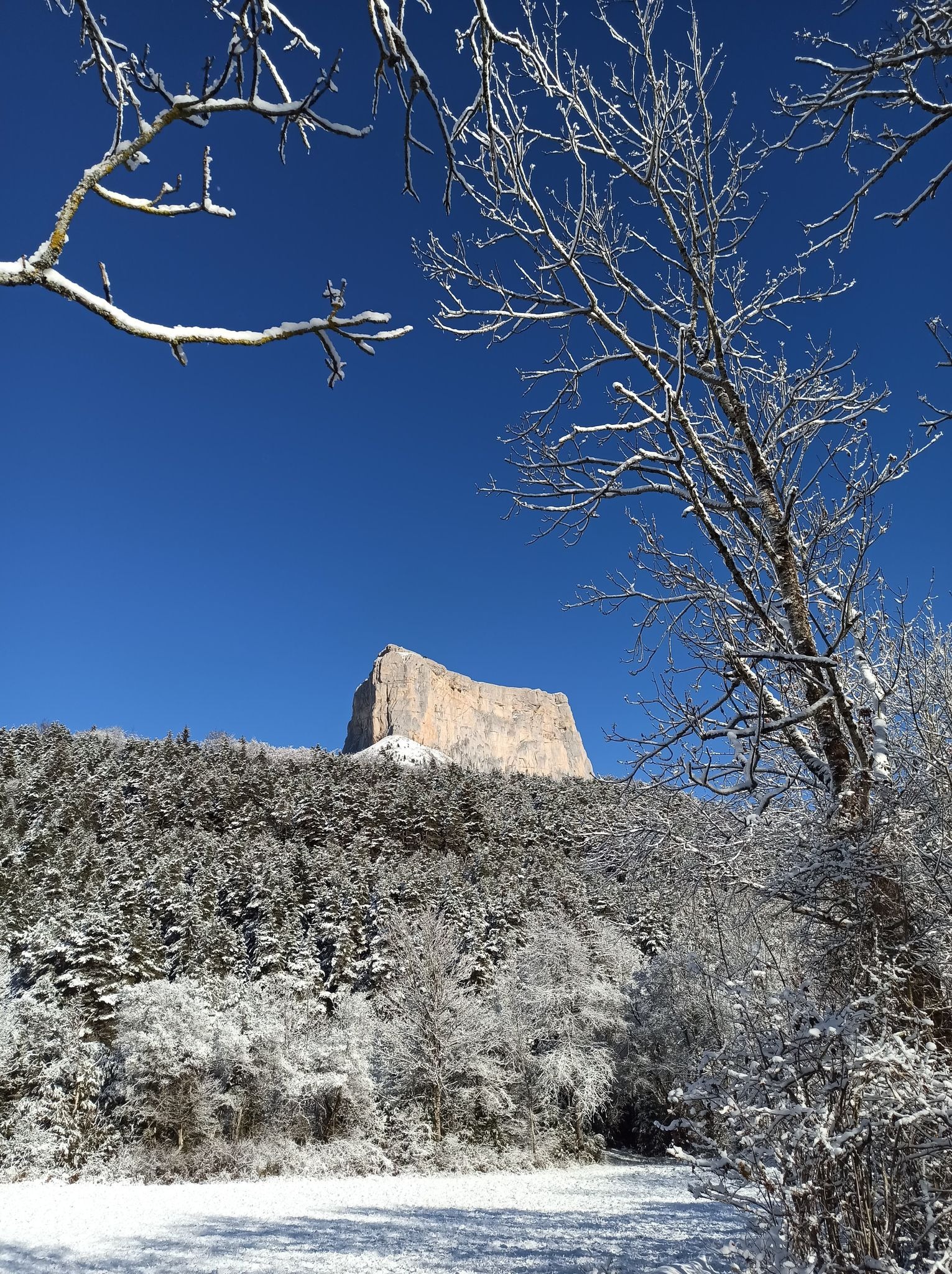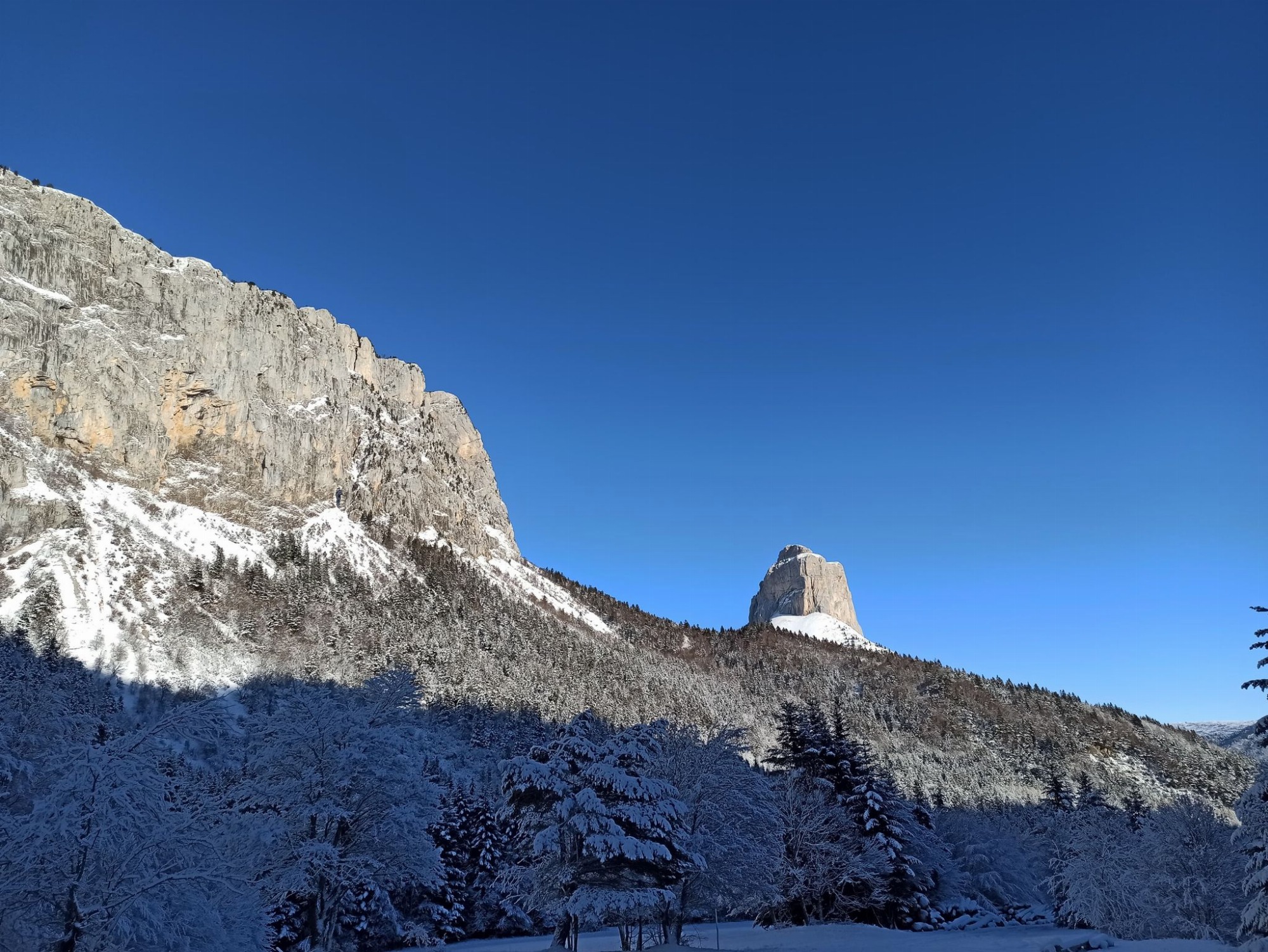 This route takes you to the bottom of the valley, at the foot of the Pas de l'Aiguille. Impressive view of the cliffs of the Rochers du Parquet and a unique view of Mont-Aiguille! Return to the other side for a snowy adventure!
