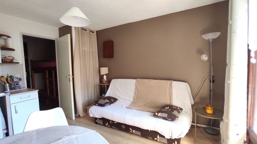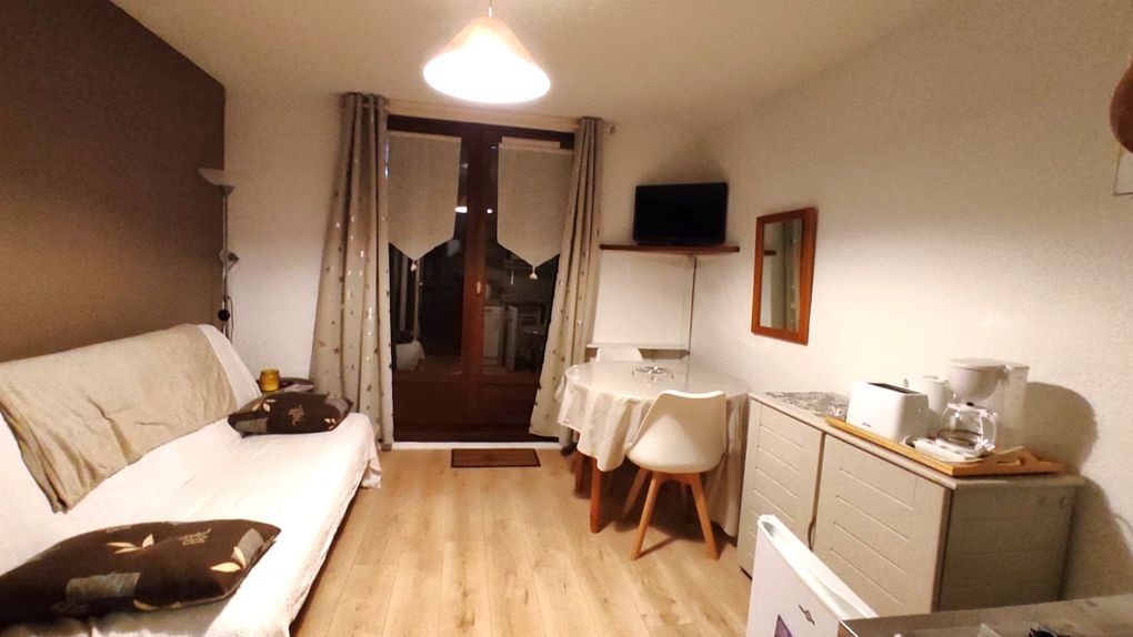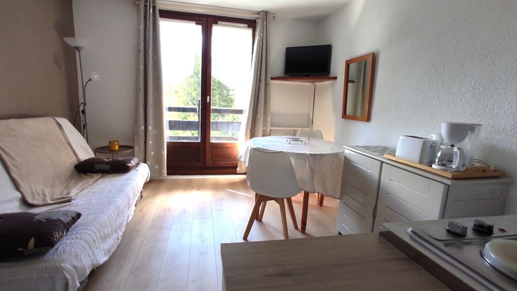 Il est composé d'1 pièce de vie avec un clic-clac (140 x 190), une kichenette et coin repas, TV, 1 lit en hauteur (90 x 190), 1 salle de bain avec baignoire, wc, un balcon
