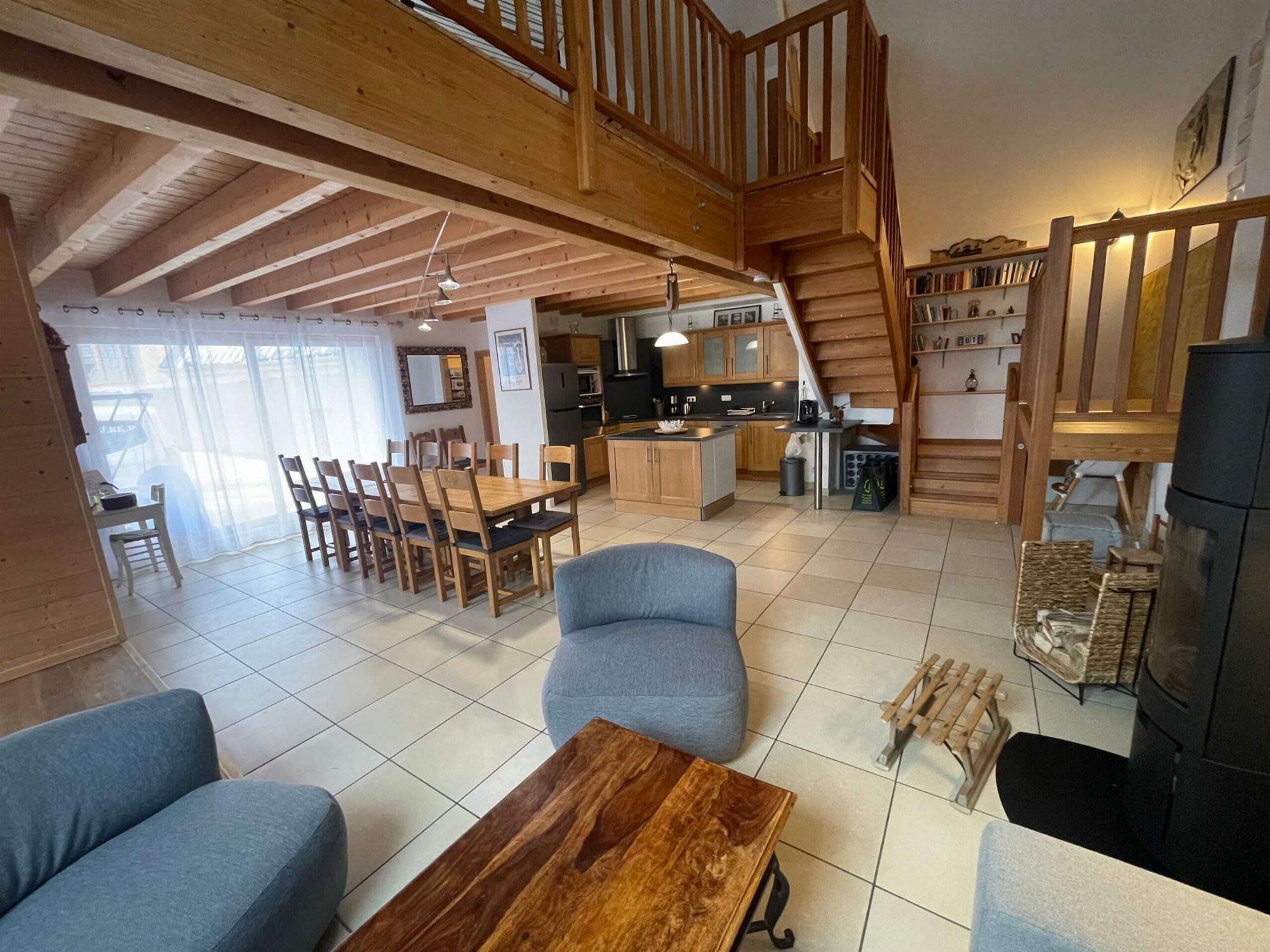 Pièce de vie de 60m² avec cuisine ouverte, coin salon et un poêle à bois.