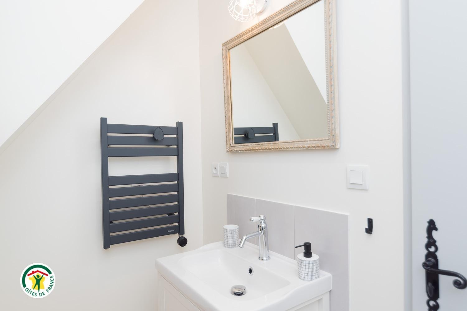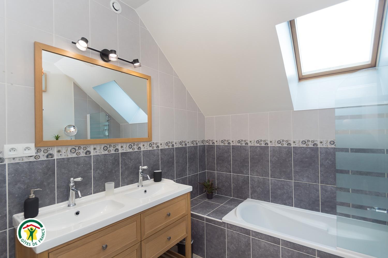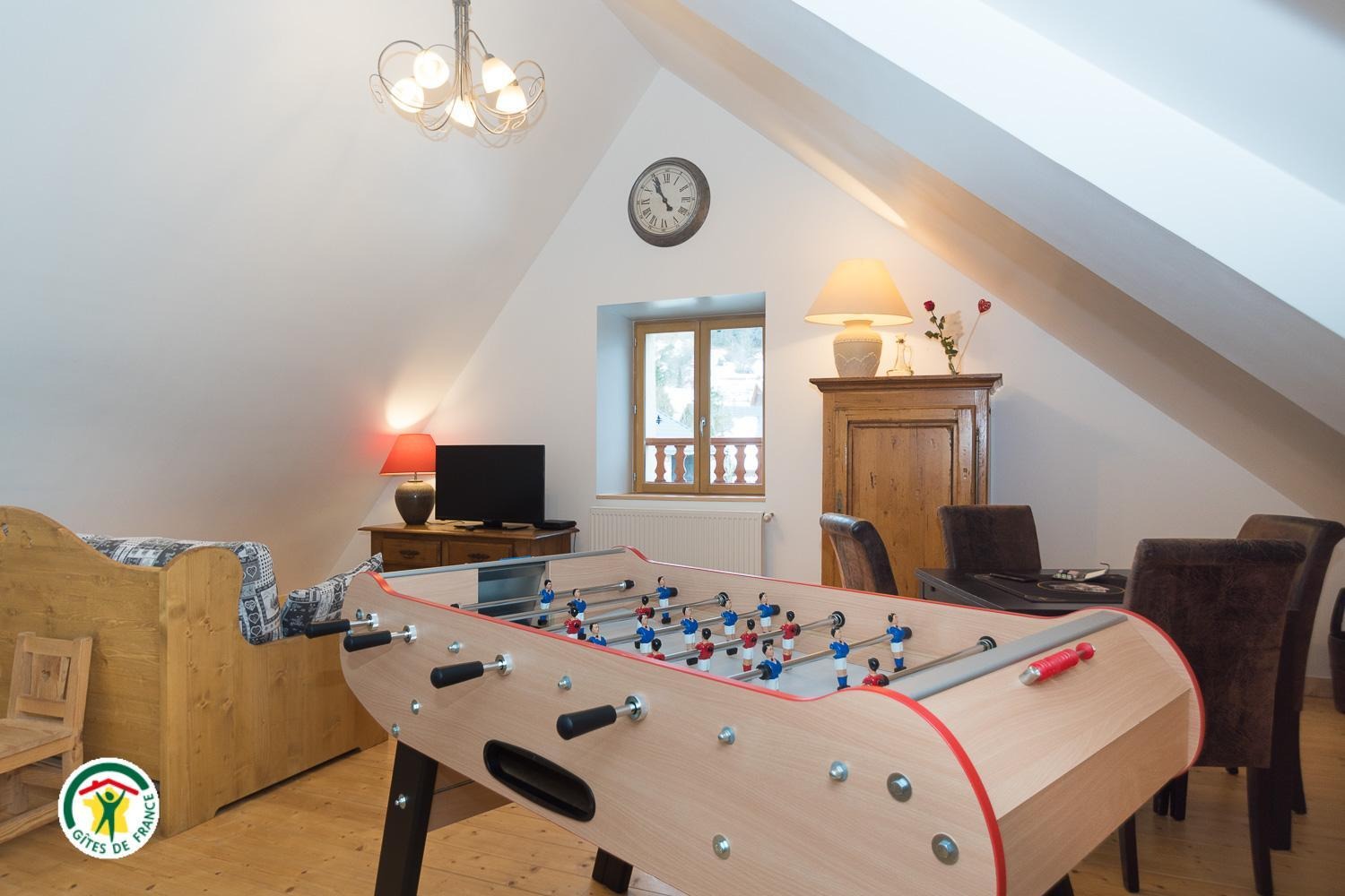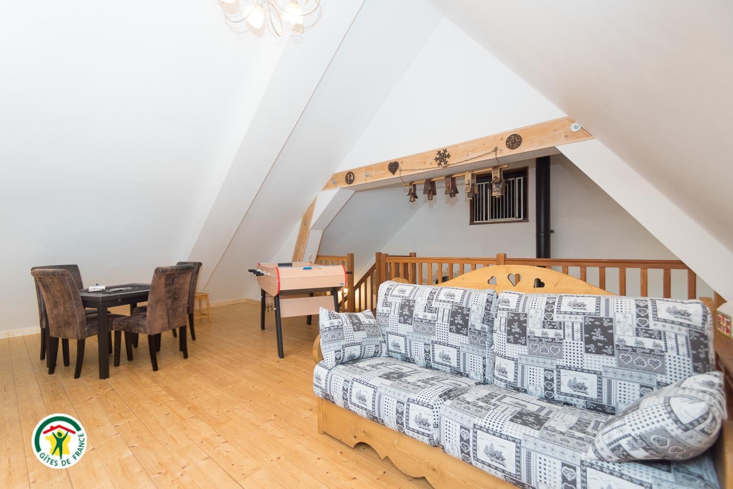 A l’étage, l’espace détente est équipé d’un coin télévision avec wifi, jeux et baby-foot et un canapé convertible permet d’augmenter le nombre de couchages si besoin.