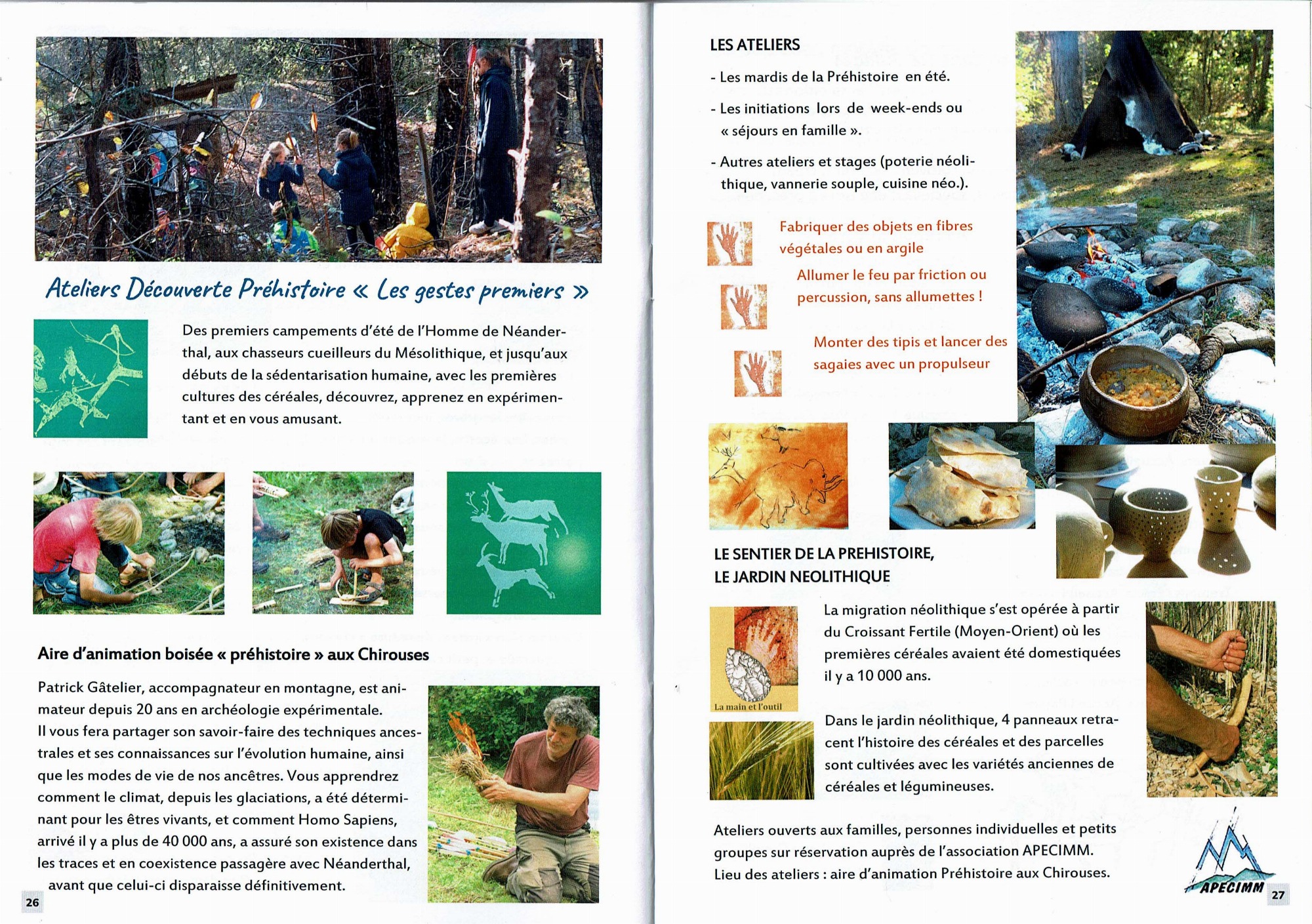 Patrick Gâtelier, accompagnateur en montagne, propose à proximité du Gîte, sur une aire en milieu naturel boisé, les ateliers « les gestes de la préhistoire » en s’appuyant sur les recherches de l’archéologie expérimentale des chasseurs-cueilleurs aux premières installations néolithiques dans les Préalpes.