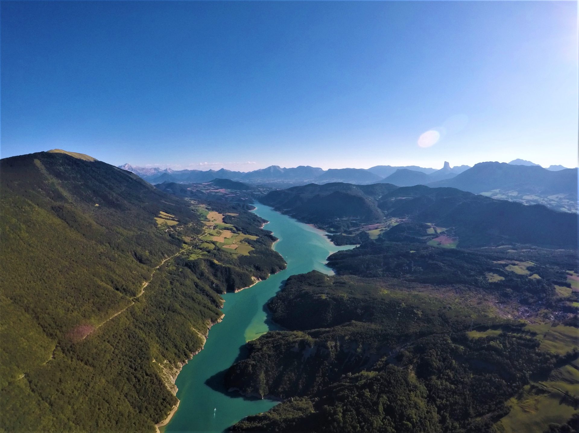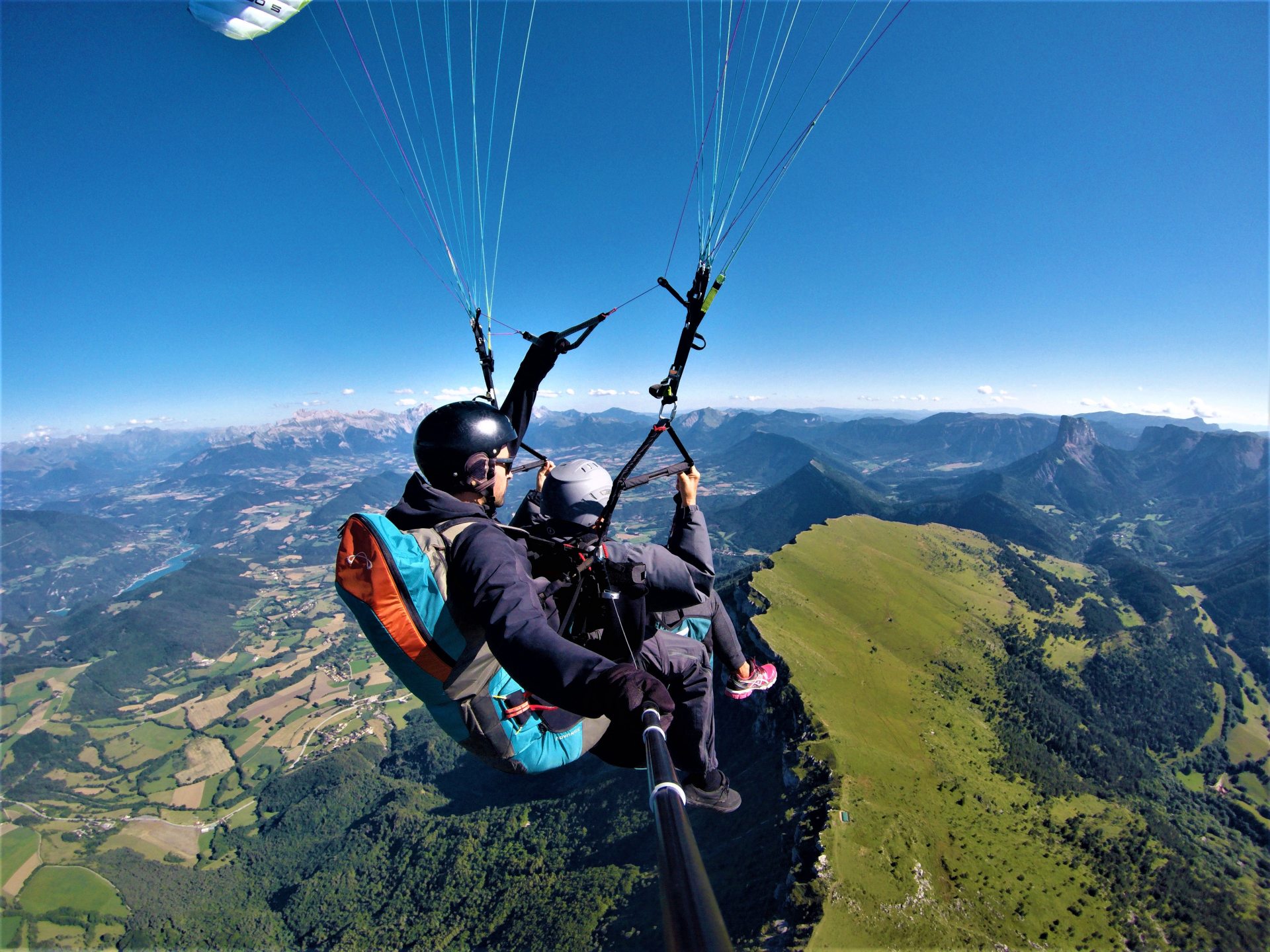 Après une course courte comme un battement de coeur, c’est le saut, un instant d’apesanteur, et ça y est, on vole ! Direction la crête du Baconnet et le lointain Mont Aiguille. Sous le soleil radieux et dans la fraîcheur piquante des courants ascendants, Jacky manie sa voile avec dextérité. Il nous montre les Hauts Plateaux du Vercors comme seuls le voient les oiseaux. Au Nord, la chaine de Belledonne et Grenoble, toute petite. Et à l’Est, on aperçoit l’éclat turquoise du lac de Monteynard, les Ecrins, l’Obiou…